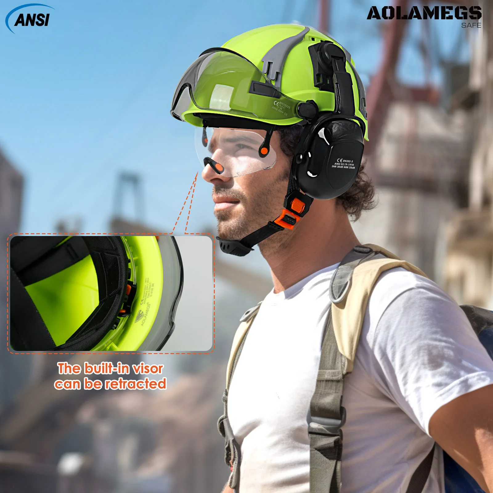 【OSHA Approved Construction Hard Hat】This cascos de Construccion safety helmet is made of high-strength impact-resistant and penetrating ABS material, which is both lightweight and strong. AOLAMEGS hard hat construction is OSHA certified and meets ANSI Z89.1-2014 Type C standards, and the hard hat visor meets ANSI Z87.1-2015 standards. Earmuffs meet standards: ANSI S3.19 NRR 23db earmuffs.