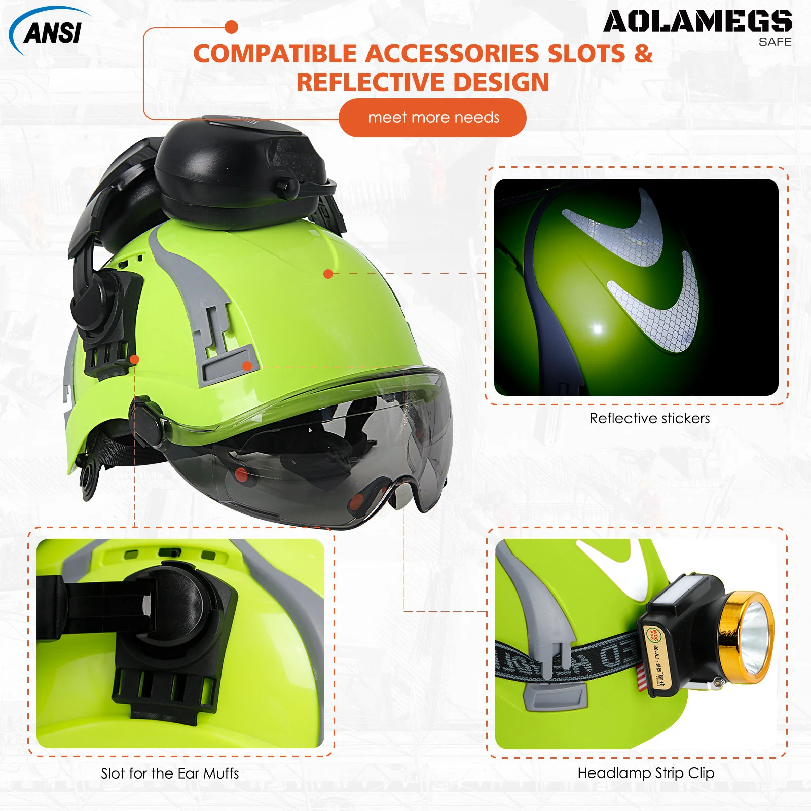 【Adjustable Vent and Slot Design】The vent system, with sliding holes on both sides of the helmet, allows workers to adjust the airflow according to weather conditions. In addition, AOLAMEGS safety helmets are designed with fixing slots to facilitate workers to install accessories, such as full-face shields, sun visors, earmuffs, and headlights. With the ability to attach different accessories to the work cap, workers can easily customize their safety gear to meet their specific job requirements.