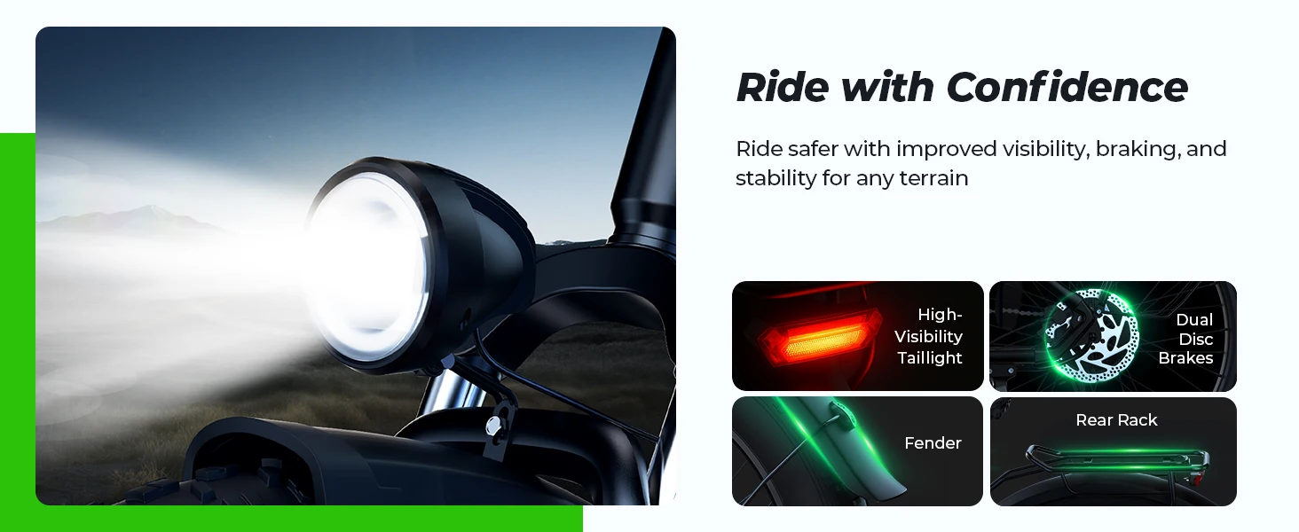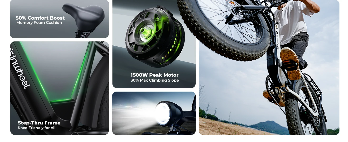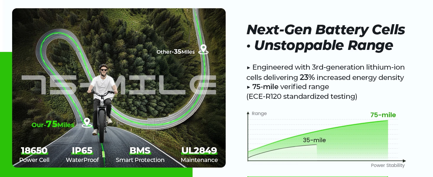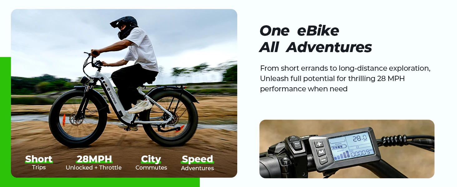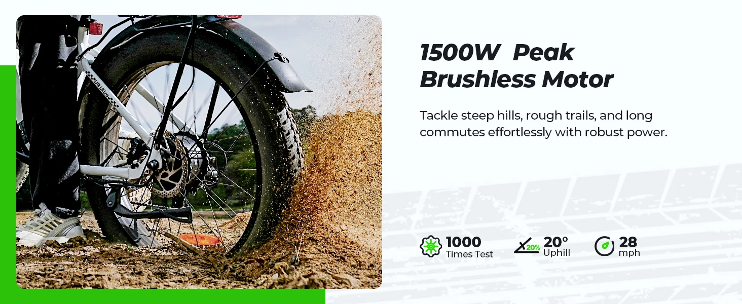 1500W High-Power Motor – The U8 Plus electric bike features a brushless 1500W peak motor, delivering 28 MPH top speed and 80Nm torque to conquer 30% slopes. Rigorously tested over 1000 cycles for reliable ebike off-road performance.