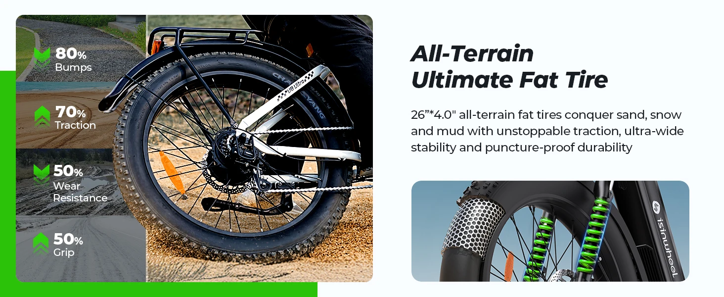 All-Terrain Fat-Tire Beast-U8 Plus Electric Mountain Bike ebike equips 26"x4.0" puncture-proof tires with 3X wear-resistant layers and drainage grooves (5000Miles tested). Full suspension, 7-speed gears, 2000lm lights, and dual mechanical discs conquer any terrain safely.
