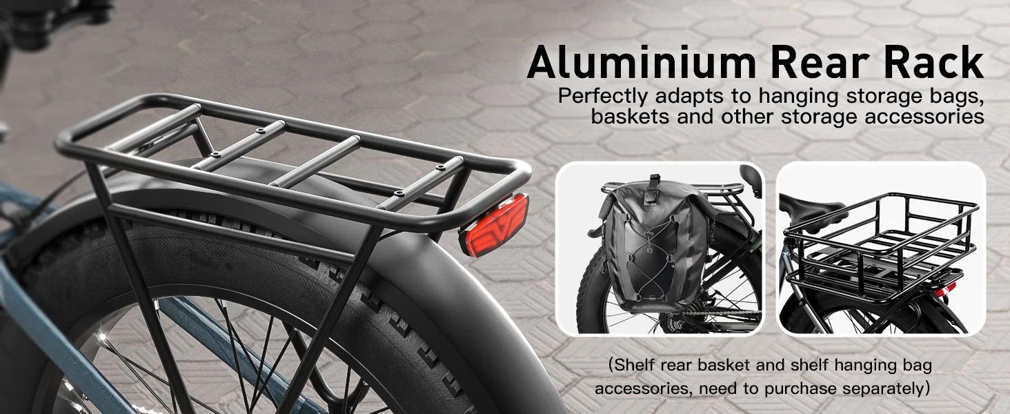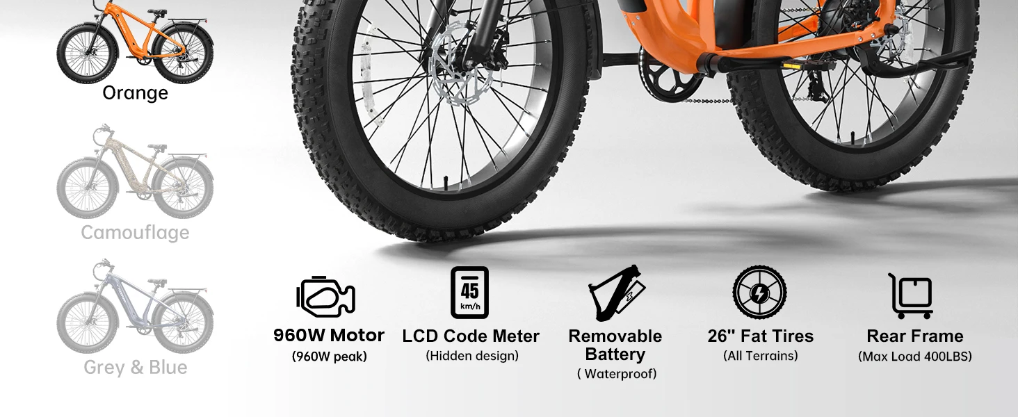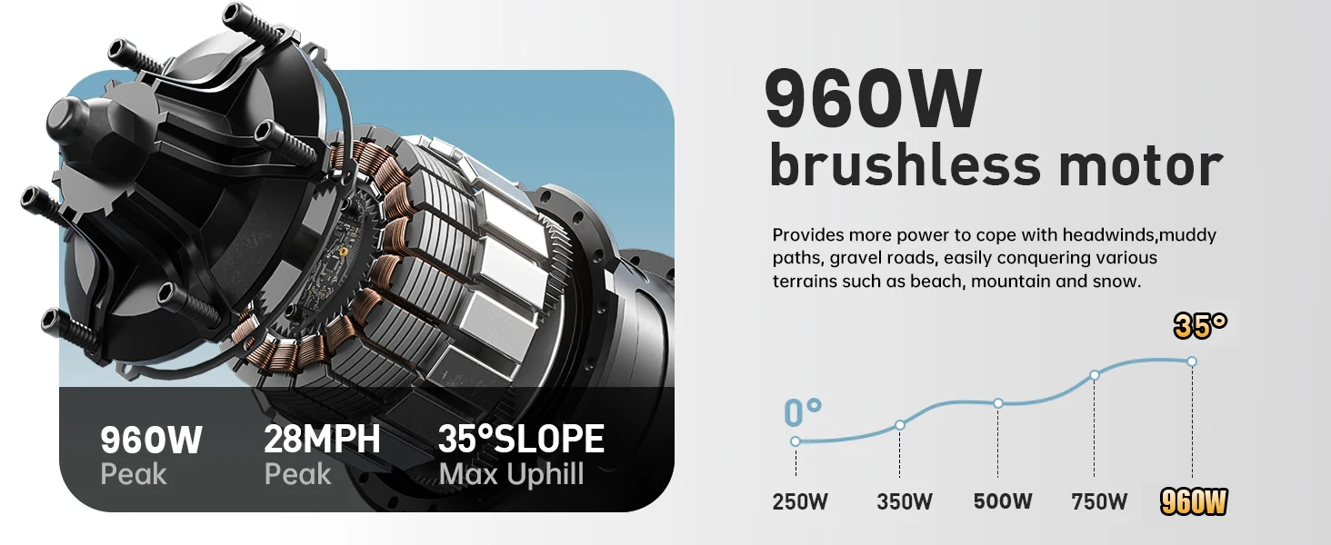960W Peak High-speed Brushless Motor: The motor of Beagle electric bicycle adopts 960W Peak high-speed brushless rear hub motor, the torque can reach up to 80NM, which can easily cope with 35° slopes; its maximum speed can reach 28MPH, which is the best in its class.
